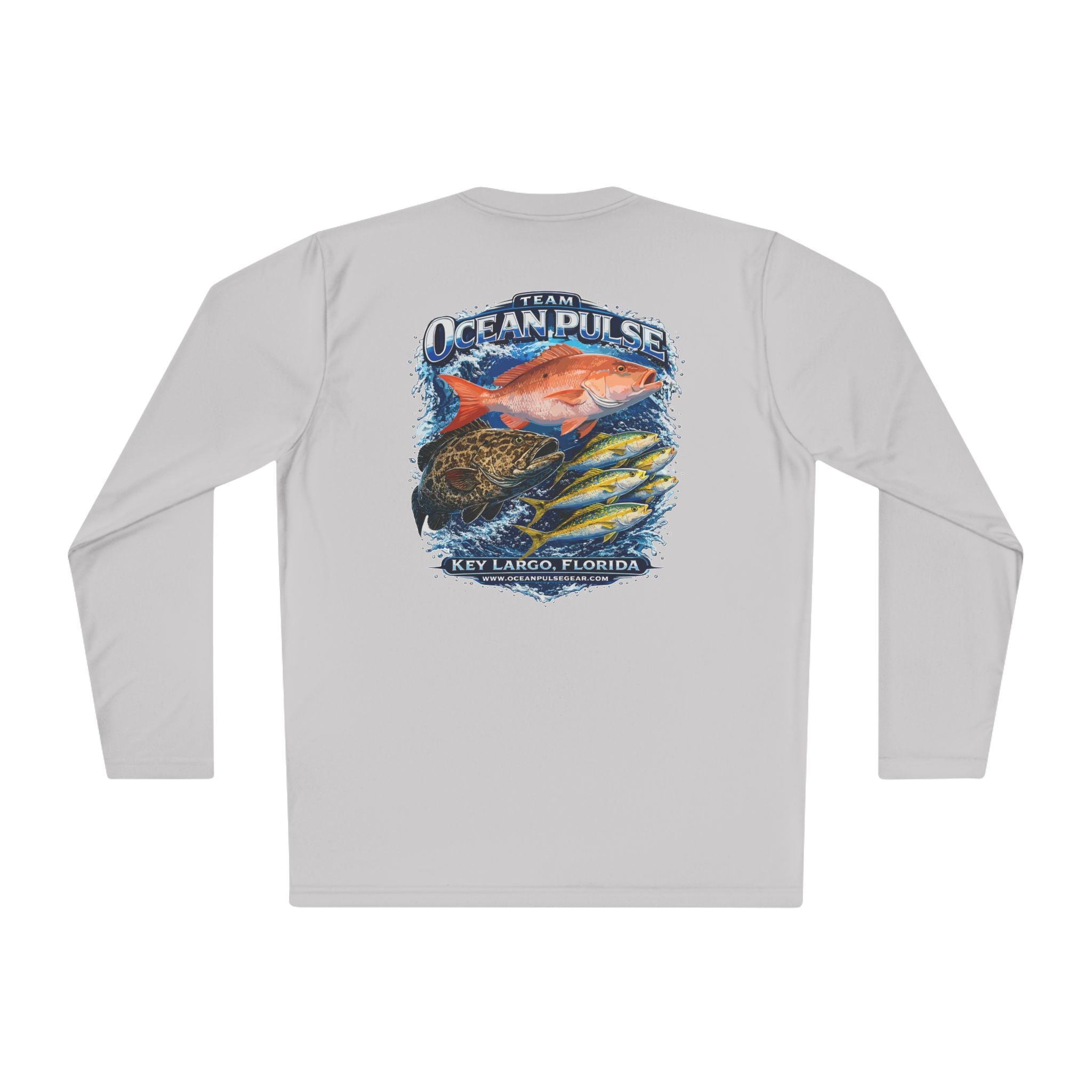 Rep the ultimate reef fishing trifecta with the official Team Ocean Pulse "Florida Keys Reef Slam" Performance Shirt. Designed for anglers who live for the bite, this shirt features vibrant, detailed artwork of the catches that define a perfect day on the water in Key Largo: a powerful Mutton Snapper, a brute Black Grouper, and a schooling frenzy of Yellowtail Snappers.